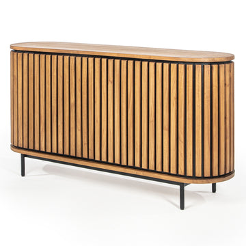 Diese Kommode aus Teakholz beeindruckt durch ihre einzigartige ovalen Form. Das robuster Material ist zugleich edel und luxuriös und versprüht einen Hauch von Raffinesse und Eleganz. Mit den Abmessungen von 150 x 42 x 80 cm ist dieses Möbelstück der perfekte Begleiter für Ihr Zuhause.